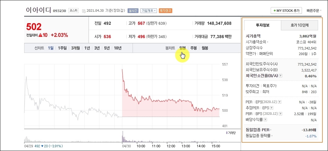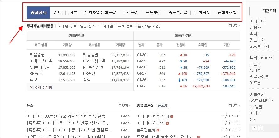 개별 종목을 클릭해 보세요. 해당 종목에 대한 금일 주식시세는 물론이고, 투자정보, 실시간 차트 등을 확인할 수 있습니다.