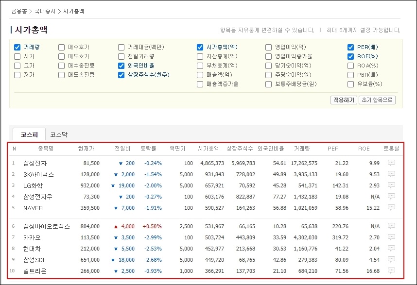 사이트 화면 좌측에 보면 금일 기준으로 시가총액, 배당, 업종, 그룹사, 상승, 보합, 하락 등 여러 특징으로 구분된 종목을 찾아볼 수 있는 버튼이 있습니다. 시가총액을 클릭해 보았는데요. 국내 주식 시장에서 가장 큰 비중을 차지하고 있는 삼성전자, SK하이닉스, LG화학이 보이네요.