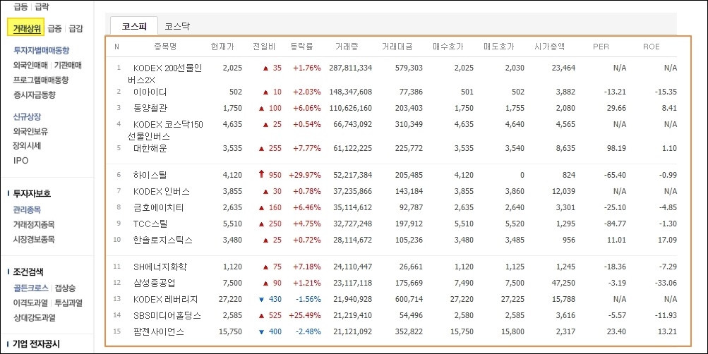 단타를 즐겨하신다면 거래량이 많은 종목을 살펴보는 것이 좋은데요. 금일 거래상위 주식 종목으로는 ETF인 KODEX 200 선물 인버스 2x, 이아이디, 동양철관 등이 있네요. 아무래도 공매도 재개에 앞서 주식시세 하락을 예상하는 사람들이 인버스 매수를 많이 한듯 합니다.