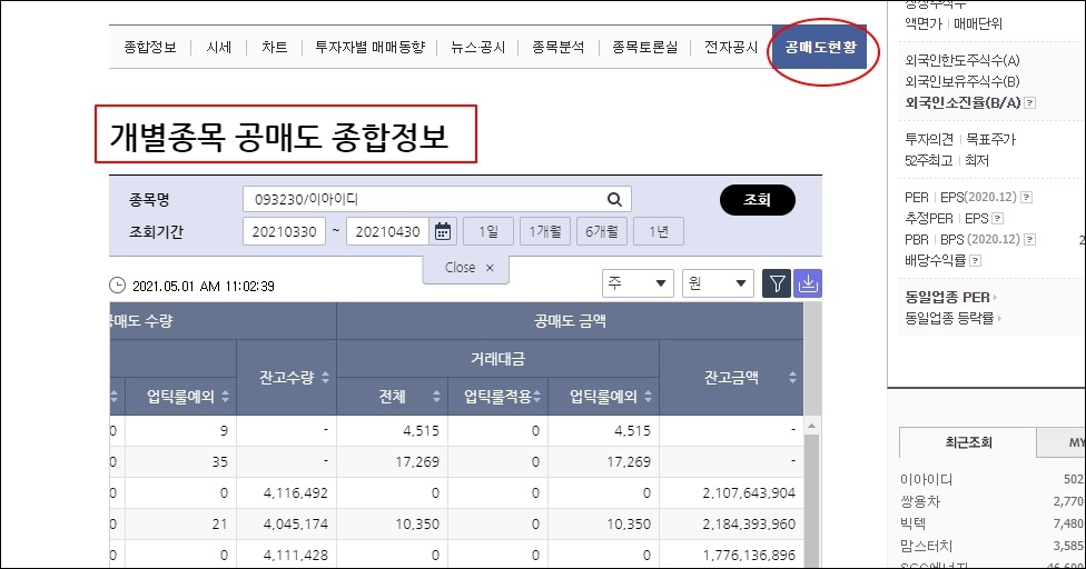 해당 사이트에서는 개별종목 공매도 종합정보도 확인할 수 있는데요. 5월 3일부터 재게가 되는 공매도의 영향을 받을 종목인지 잔고금액을 확인해볼 수 있습니다.