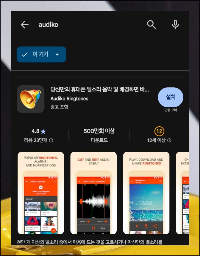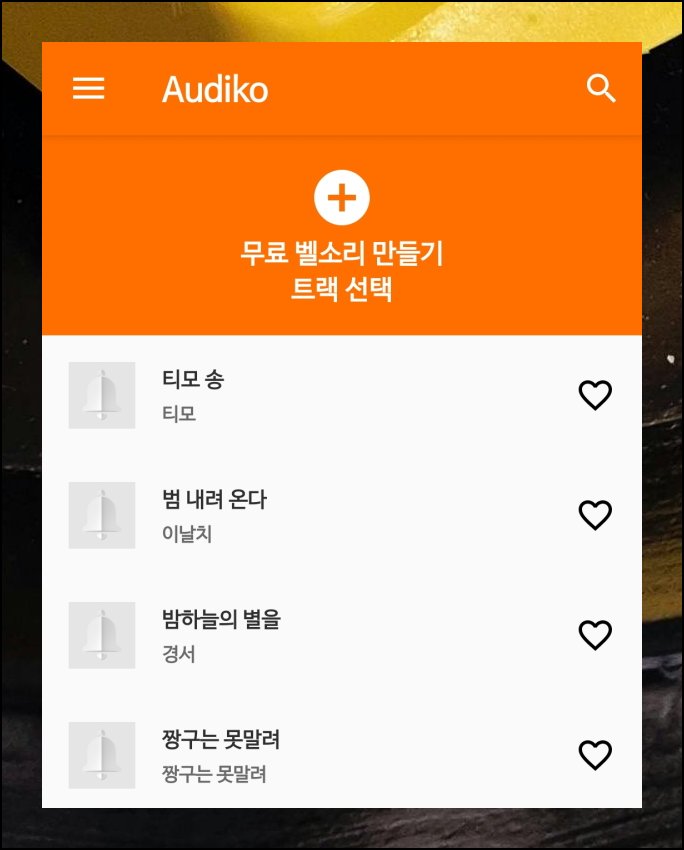 먼저 AUDIKO라는 전용 어플을 설치해야 합니다. 구글 플레이 스토어에서 손쉽게 검색할 수 있는 무료 앱이에요. 전화 벨소리 관련 기능과 함께 배경화면용 이미지도 함께 제공합니다. 두 가지 함께 사용하면 좋을 거에요. 무료 서비스라서 부담 없이 시작할 수 있습니다.